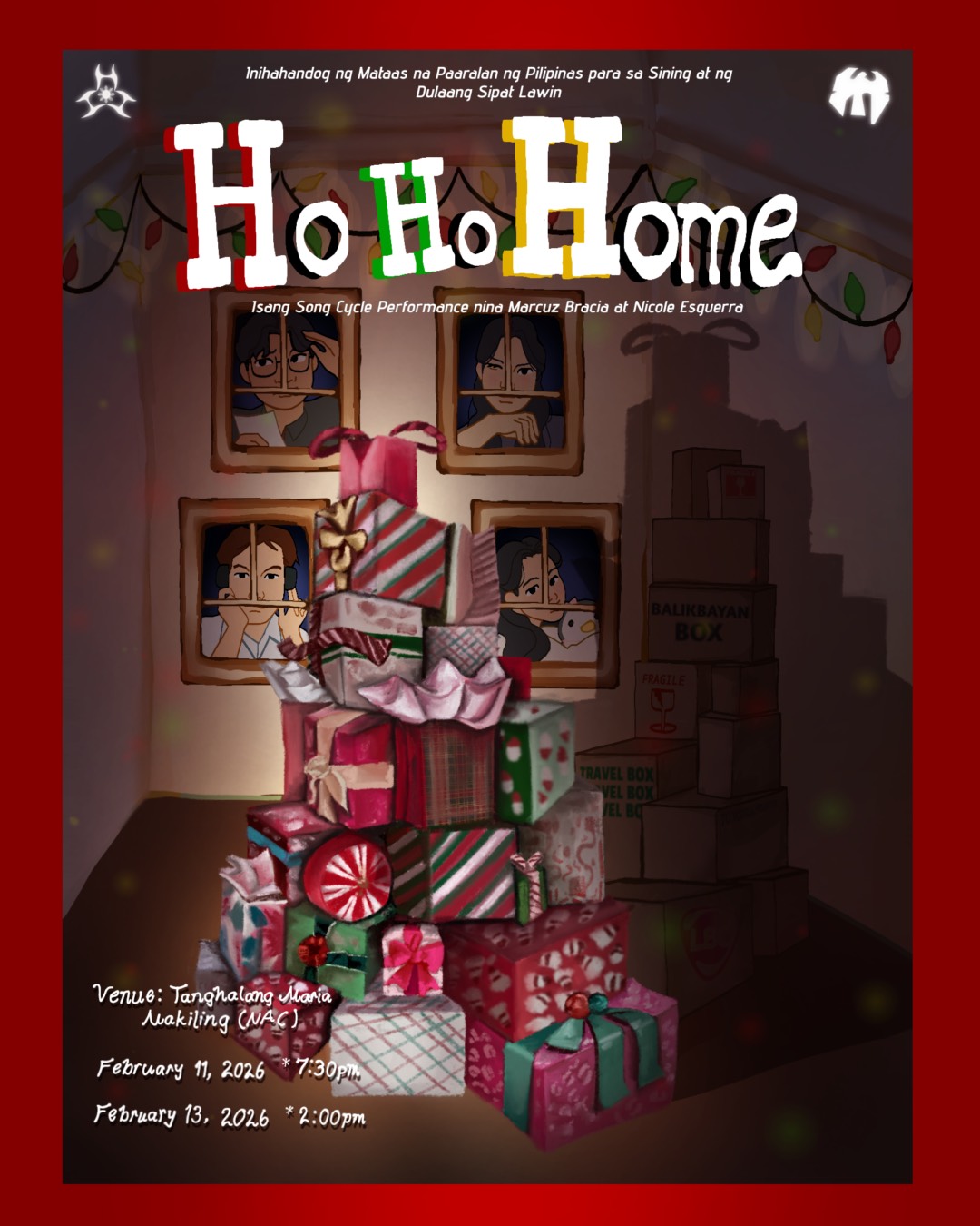 Nicole Grace S. Esguerra and Marcuz Romeo B. Bracia’s 𝐇𝐨 𝐇𝐨 𝐇𝐨𝐦𝐞 is a song cycle performance that follows the struggles that characters Mac, Isabel, Andrew, and Phoebe face as children of Overseas Filipino Workers (OFWs ).